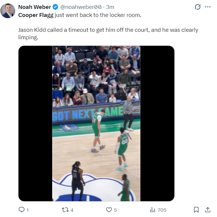 第三节弗拉格打了7分钟,弗拉格在一次追防过程中左脚意外扭伤,随后弗拉格一瘸一拐的走回了更衣室。独行侠记者表示:基德主动叫暂停换下弗拉格,弗拉格的确是一瘸一拐的。